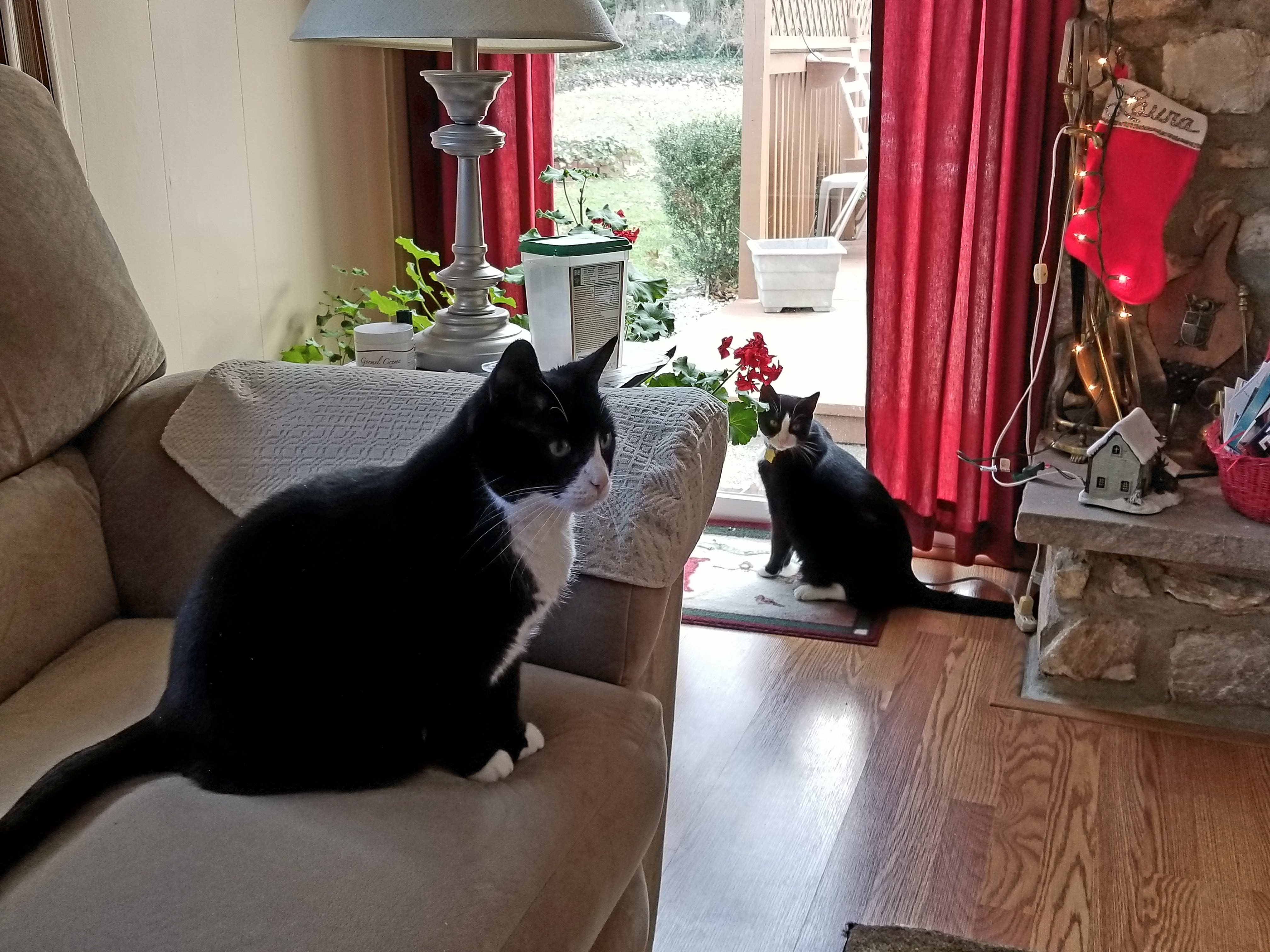 Well. LET ME TELL YOU. There was a LOT of hissing when we arrived, but we stayed a whole week, and Feelings Have Changed. Clinton continued to follow Chelsea around, but less in a stalking, aggressive way, and more just to see what she'd do? And while Chelsea would continue to hiss occasionally for plausible deniability (think Buffy punching Spike just to prove she's not in love with him), mostly she just let him follow her around.
